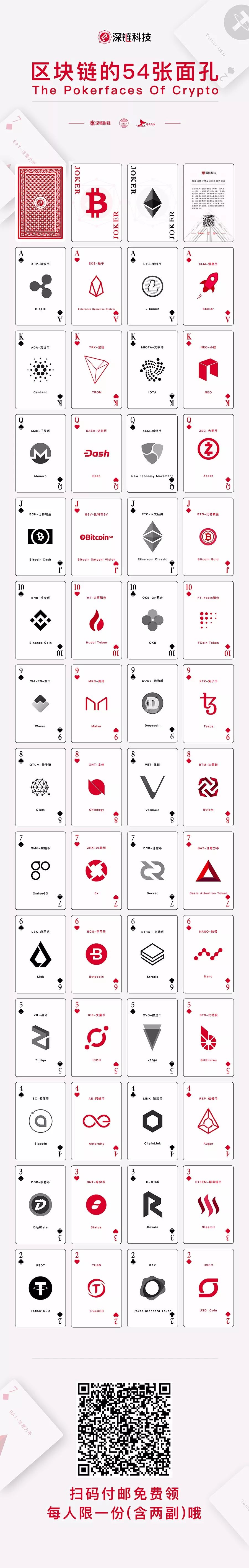 在深链财经一周年之际,我们重磅推出币圈扑克,54张牌,加密货币的54张面孔,币圈人自己的扑克,现在可以扫描长图二维码或阅读原文,即可免费领取。一套2副,邮费自理(10元)。