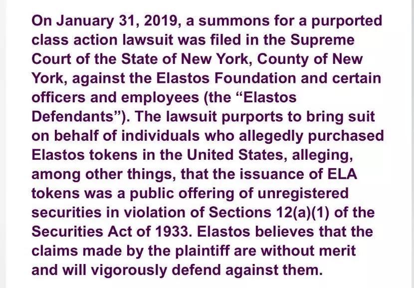 2月11日,亦来云(ELA)被传遭美国投资者Mark Owen起诉,项目基金会及其团队成员成被告。投资者指控,亦来云项目在未经授权的情况下出售代币。