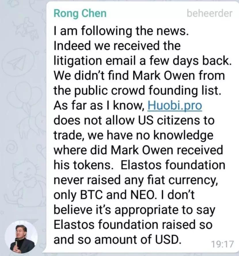 2月12日晚7点50分,亦来云联合创始人韩峰在接受蜂巢财经采访时重申基金会并没有收到法院传票。13日凌晨,他给出了亦来云海外社区的正式回复称,ELA方面认为,原告提出的赔偿要求是没有价值的,他们将进行辩护。