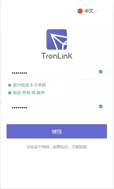 1. 单击插件图标,设置钱包密码,点击继续。注意:波宝为去中心化钱包,密码请务必牢记。密码忘记,官方将无法帮助用户找回。