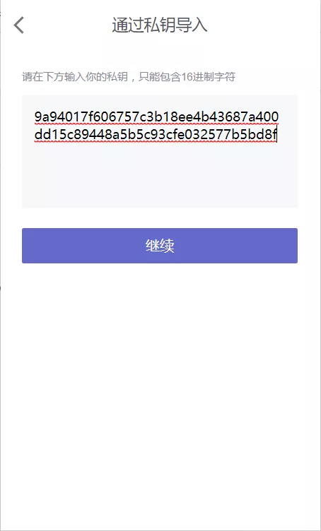 5. 本教程以导入私钥为例,请在正确输入钱包私钥之后,点击“继续”。