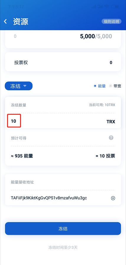 3. 输入需要冻结的TRX,点击冻结,获取相应投票数量。