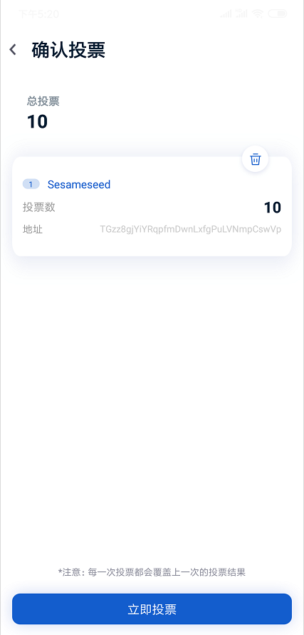 5.进入确认投票页面,点击“立即投票”,并输入钱包密码即可完成投票。