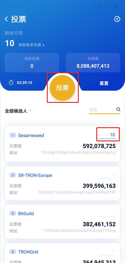 4. 回到投票页,列表中找到想要投票的超级代表,在右侧输入投票数量,点击“投票”按钮。