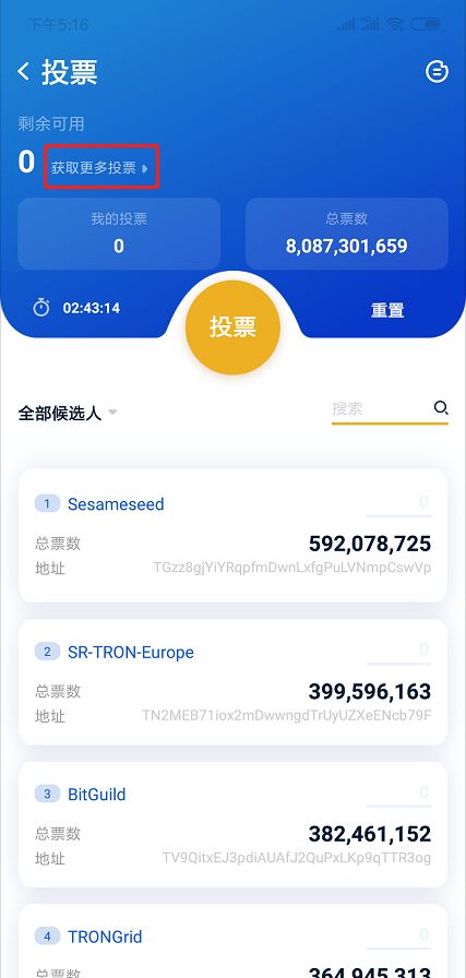2. 新用户请点击“获取更多投票”,通过冻结TRX来获取投票资格,1TRX=1票。