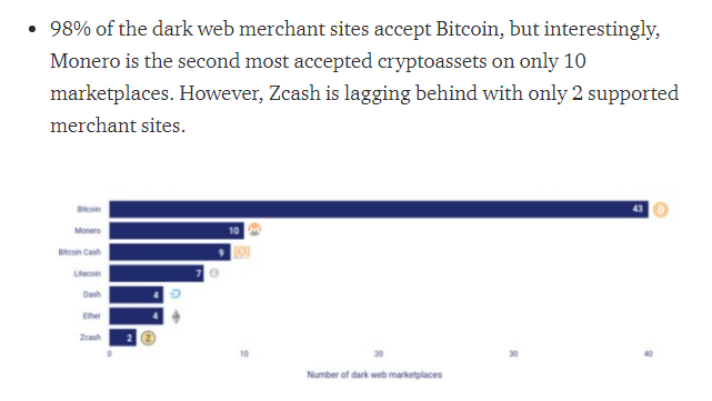 注:根据Mosaic关于隐私币的研究报告下显示43家(98%)暗网商户网站接受比特币,10家(23%)接受门罗币。而慢雾科技创始人余弦则援引该数据并表示,如果将恶意蠕虫的地下世界也考虑在内,门罗币在暗网世界的活跃度与生态是第一(图片截自:Mosaic分析师Eli Ndinga的Medium账户)