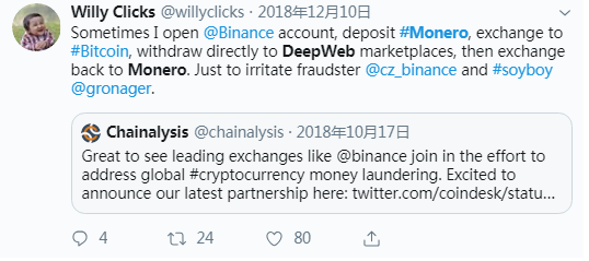 而更为有趣的是,去年十月币安宣布与Chainlysis合作并加入反洗钱监控时,确实有网友扬言要利用门罗币从中捣乱;这位名为Willy Clicks的推特用户表示,有时候他会新建一个币安账户,存入XMR,兑换为BTC,然后直接提现至暗网市场,再重新兑换回门罗币,这番操作下来只为刺激一下币安CEO赵长鹏。从某种程度上来说,门罗币能够让人“肆意妄为”的属性,的确与暗网这个最为自由且人性最为释放的地方有着不谋而合之处。
