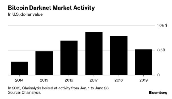 比特币在暗网市场的年度交易额(数据源自:Chainlysis)