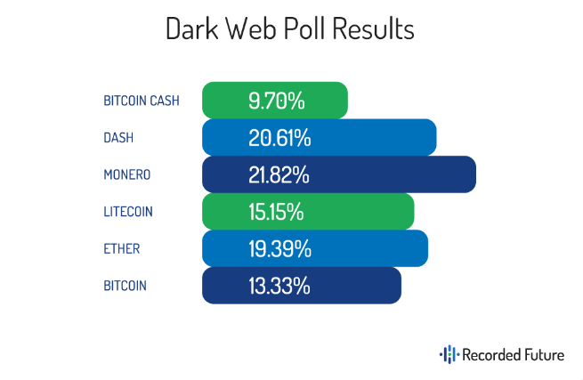 注:根据黑客论坛关于暗网内加密货币接受程度的投票情况显示,门罗币的受认可度最高,比特币仅高于BCH(数据源自:Recorded Future;截止时间:2018年2月)