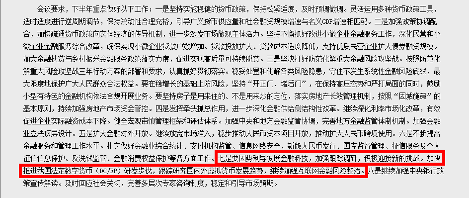 2019年8月2日,人民银行召开2019年下半年工作电视会议。会议提出,加快推进我国法定数字货币(DC/EP)研发步伐,跟踪研究国内外虚拟货币发展趋势,继续加强互联网金融风险整治。