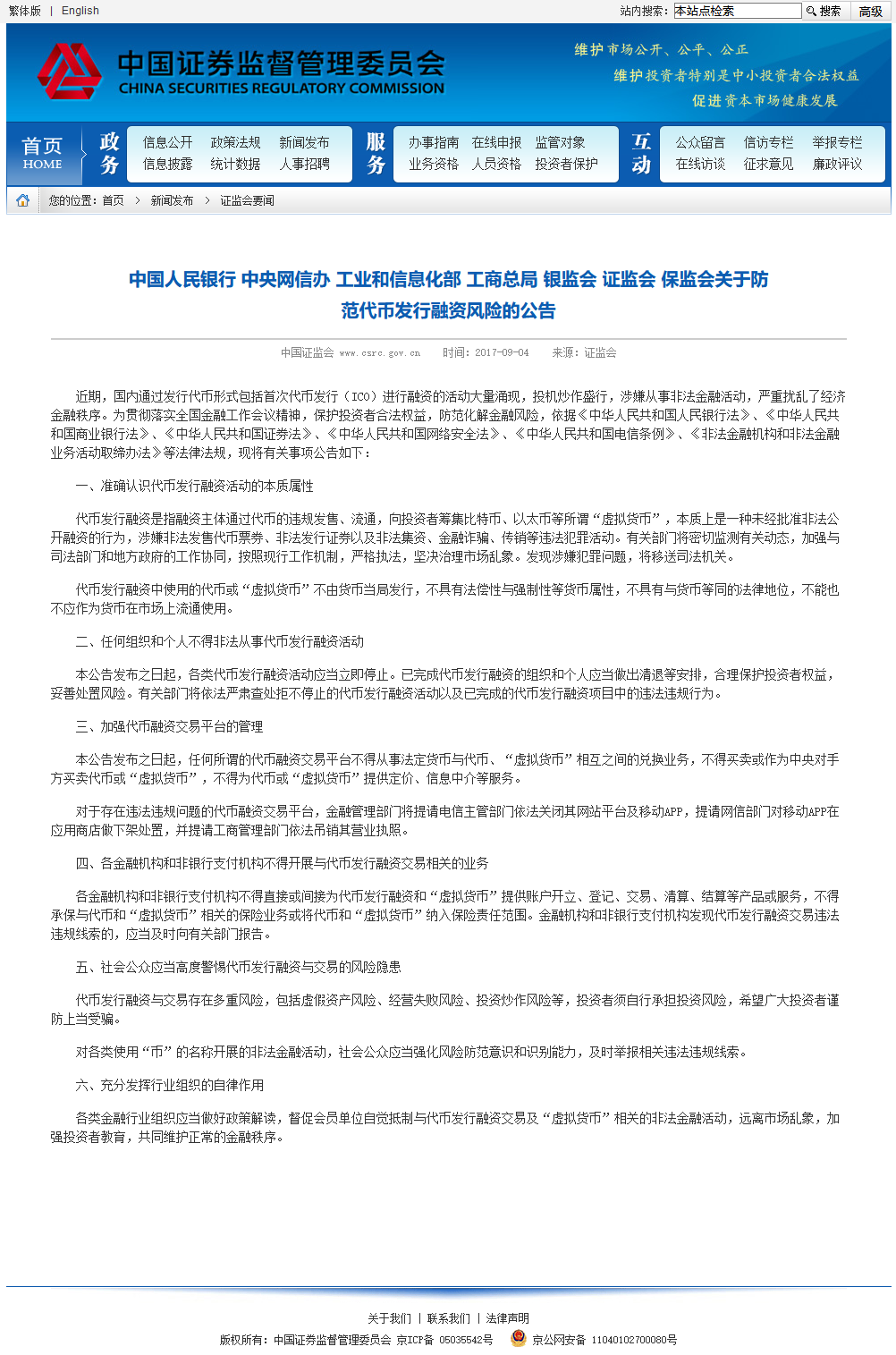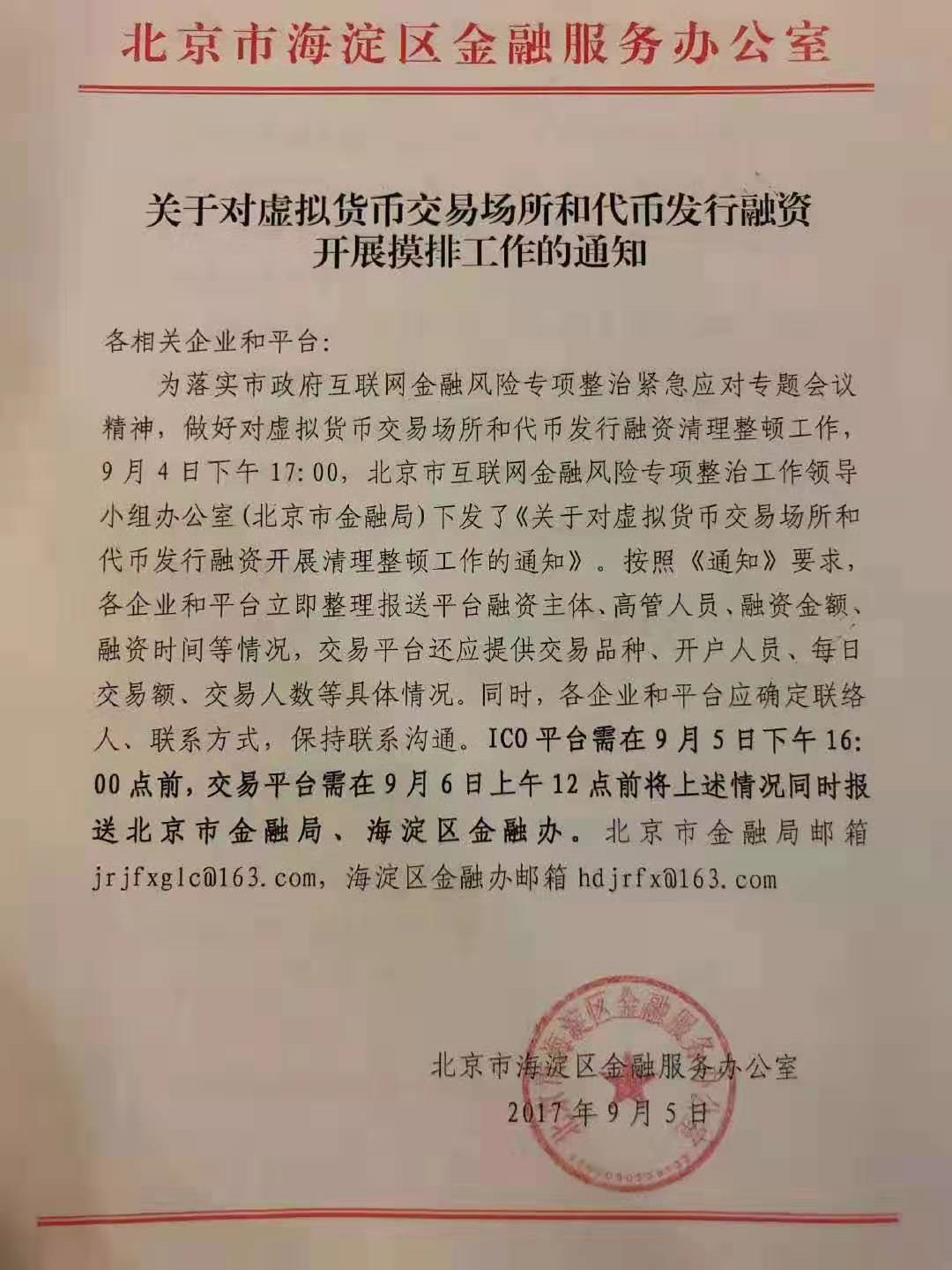 2017年9月4日,中国人民银行等七部委发布了《关于防范代币发行融资风险的公告》。公告中指出,ICO为非法金融活动,严重扰乱金融秩序,叫停了国内所有代币融资项目。