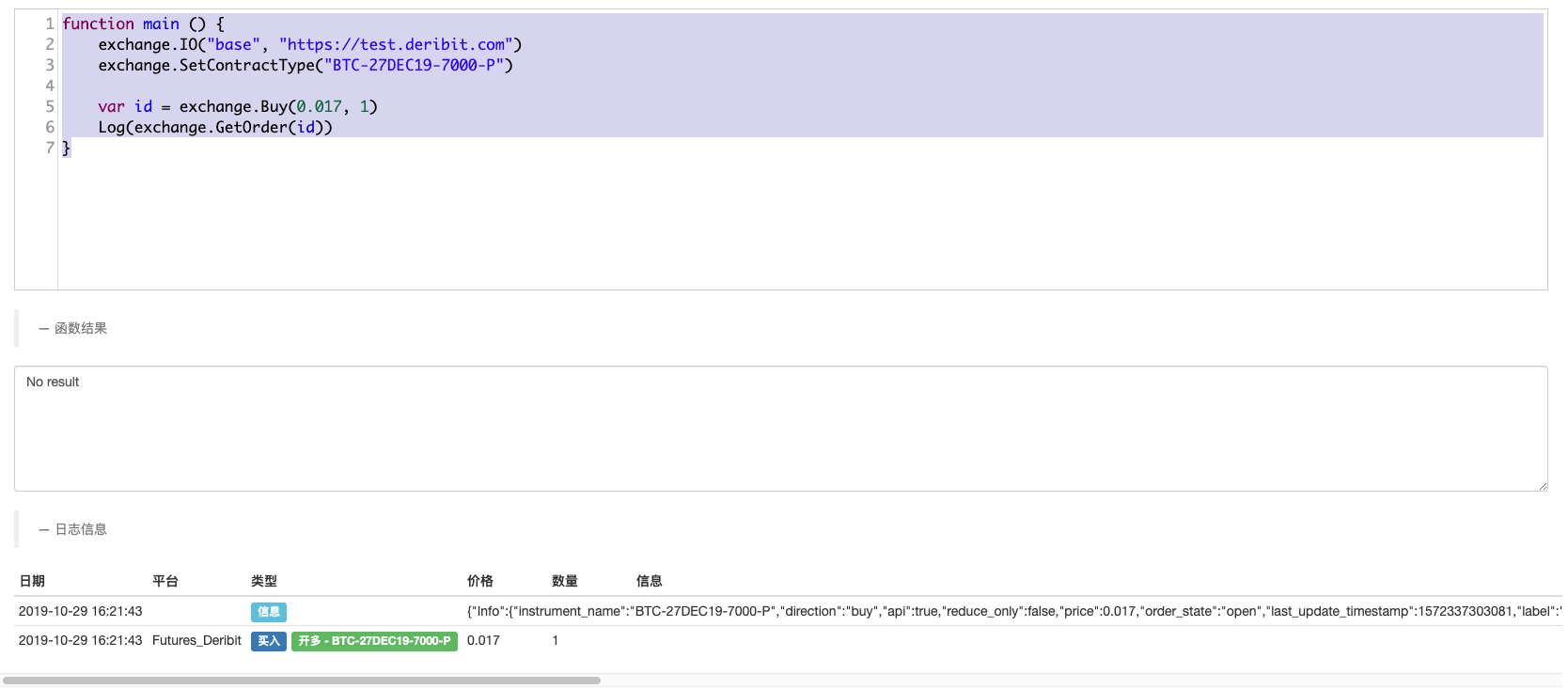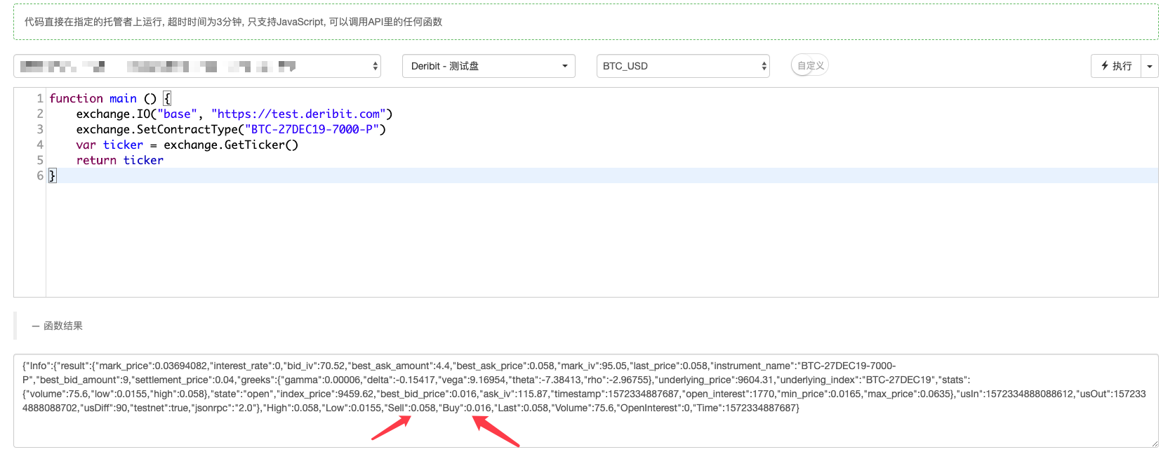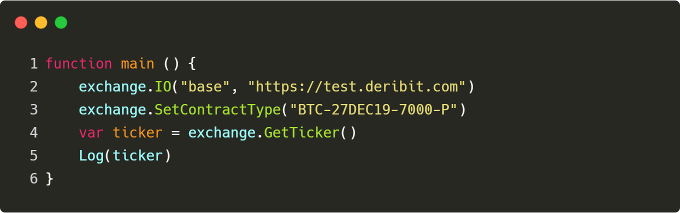 看了Deribit交易所的API文档可知,Deribit的行情接口对于访问期货或者期权行情,仅仅是传入的instrument_name参数不同而已(instrument_name是通过函数SetContractType设置的),那么基本上就可以沿用获取行情的接口GetTicker获取期权的行情。