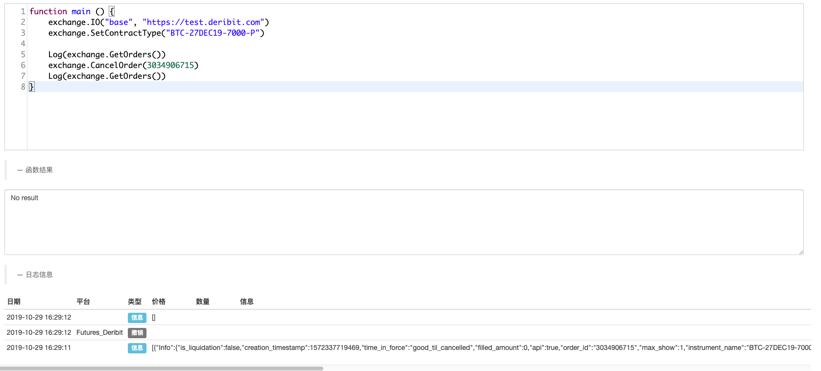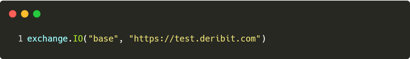 当然,发明者量化交易平台封装的默认是Deribit交易所的实盘,我们首先要切换到模拟盘,使用如下代码:
