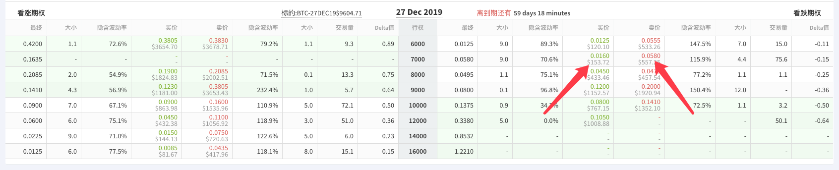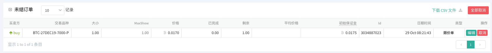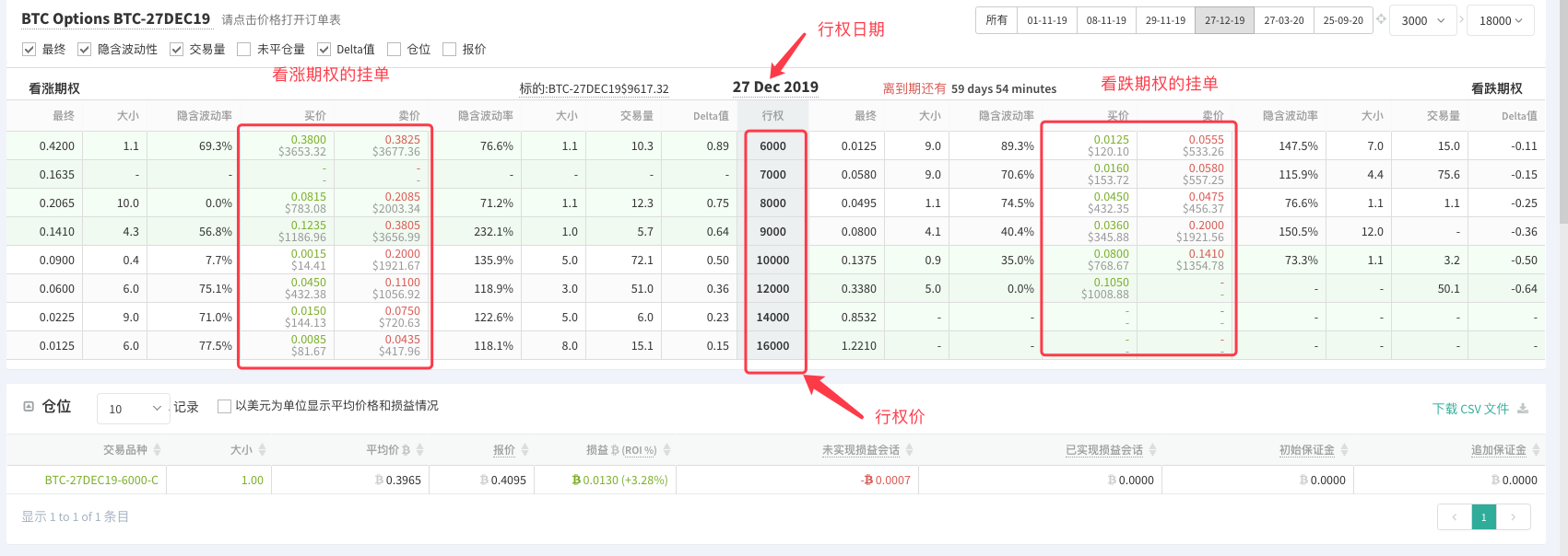 然后我们当前设置为期权合约BTC-27DEC19-7000-P:这个是行权日期为:27DEC19,行权价格为:7000的看跌期权