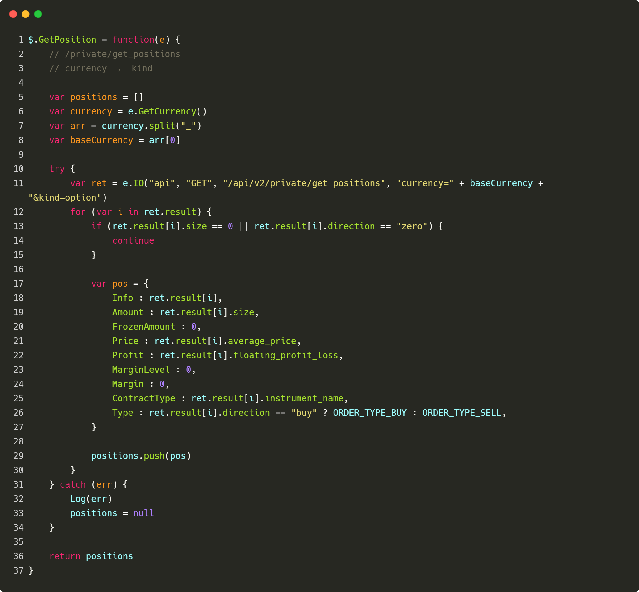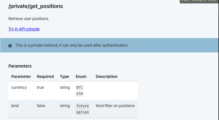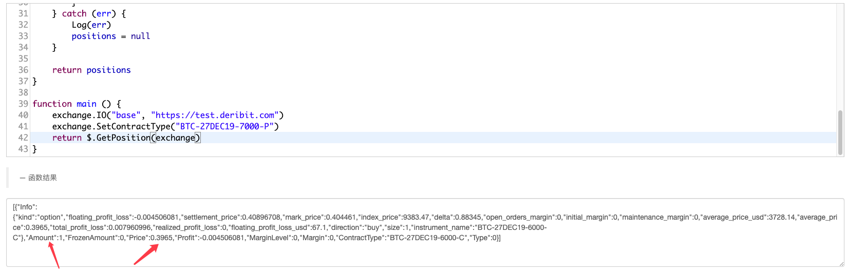 持仓方面就不能直接使用封装好的GetPosition函数了,因为默认Deribit交易是期货交易,并不是期权交易,只能用这个函数获取期货持仓。所以这个就必须要我们自己动手封装获取期权持仓的函数了。API文档上获取持仓的函数接口:
