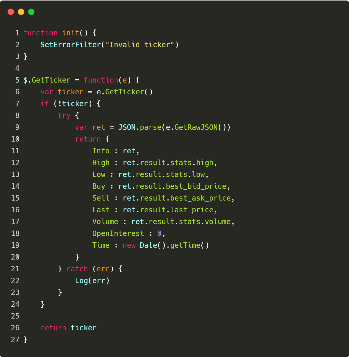 调用时写:Log($.GetTicker(exchange))