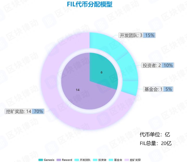 那么,从流通盘看 Filecoin 贵不贵呢?区块律动 BlockBeats 整理了 Filecoin 代币分配方案如下。FIL 代币总量 20 亿,其中 70% 在后续挖矿中产生,1 亿基金会、2 亿投资者和 3 亿 Protocol Labs(Filecoin 开发团队),其中官方的份额有 6 年线性锁定期。FIL 代币的众筹价格则根据投资轮次、锁定期限的不同有 0.75 美元(私募)、1-5 美元(公募)两档,经计算加权成本为 1.29 美元。