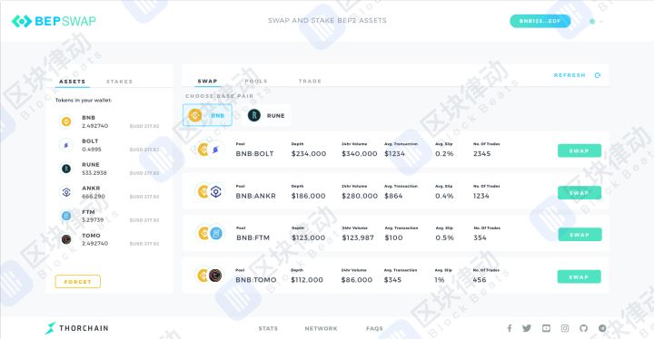 说白了,Thorchain 就是要做一个更好的 Uniswap,做一个没有 limit order 而是由流动性组建而成的 DEX 市场。并且,Thorchain 主要会在币安链上发力,致力于成为币安链 DeFi 的领军者。这么说是因为,Thorchain 发布的第一个产品 BEPSwap,已经能够基于币安链进行抵押、交易 BEP2 资产。