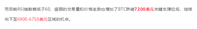 在昨天的文章中有分析到,BTC跌破7200美元后会继续向下至6900-6750美元位置: