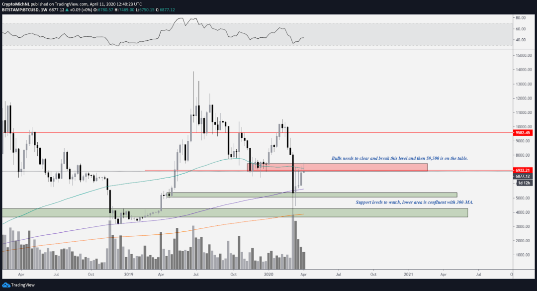 根据周K来看,如果收盘价在红色区域上方,那么将发出持续的看涨信号,6900美元的阻力位将被清除,此外,比特币的价格收回100周MA,可以进一步证明市场看涨的信号。