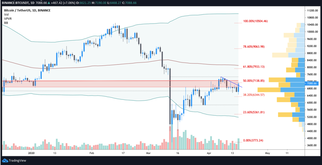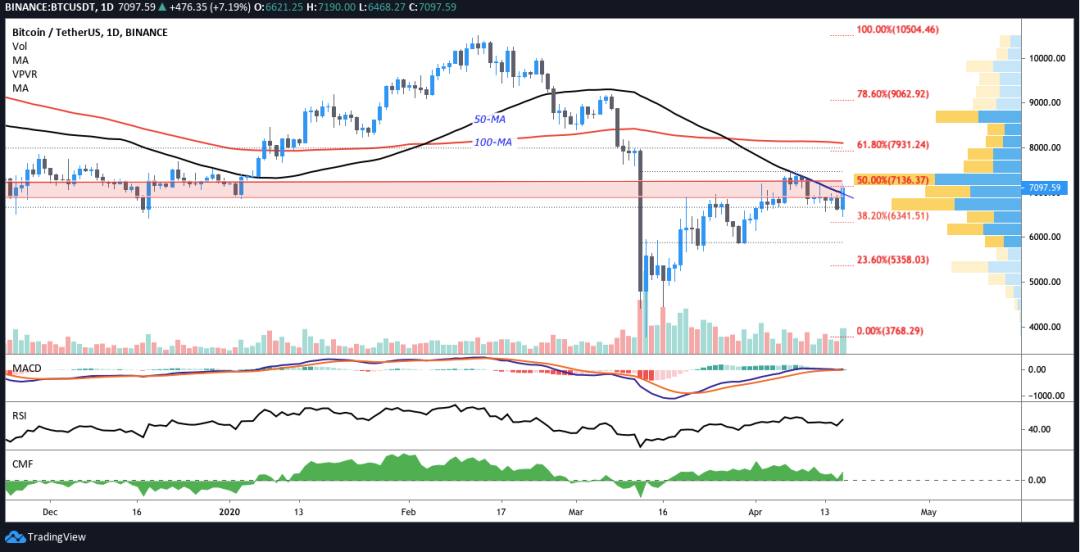更乐观的看法是,比特币价格将突破0.5fib升至7250美元,但除了0.5fib水平是阻力位之外,还有一个高交易量的VPVR节点在7200美元,如果多头能将价格推高至这个节点(7200- 7400美元)区域,则有可能会达到100MA(8100美元)位置。