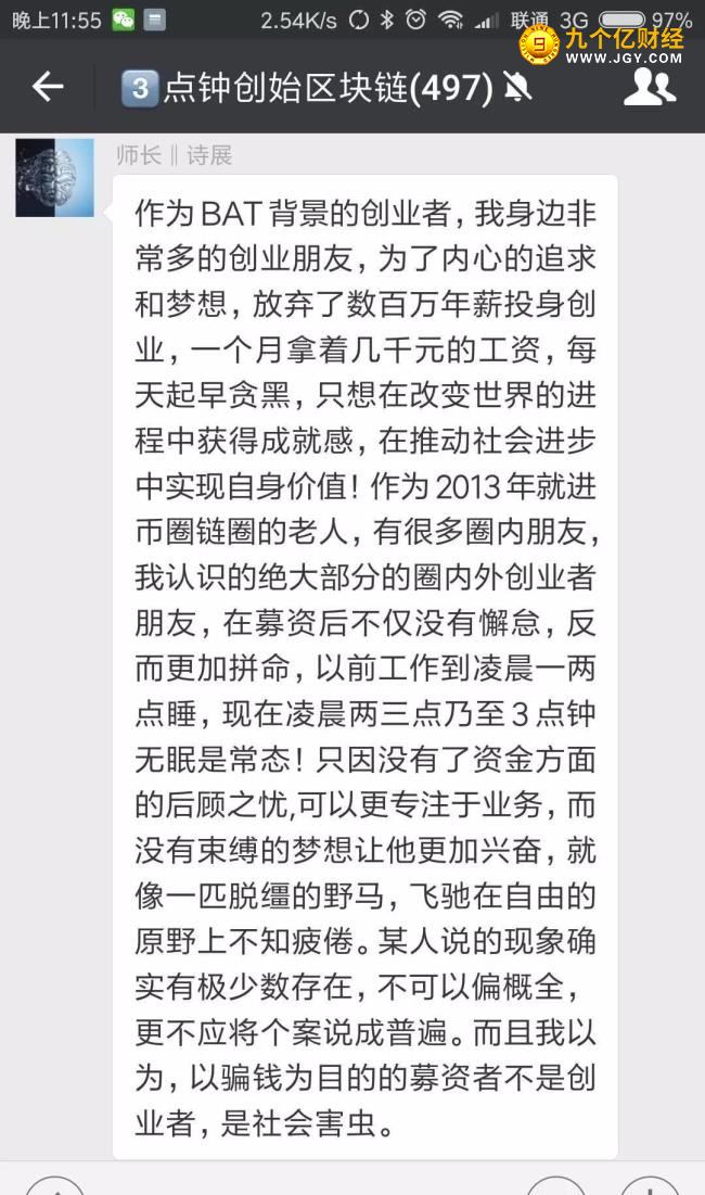 作为BAT背景的创业者,我身边非常多的创业朋友,为了内心的追求和梦想,放弃了数百万年薪投身创业,一个月拿着几千元的工资,每天起早贪黑,只想在改变世界的进程中获得成就感,在推动社会进步中实现自身价值!作为2013年就进币圈链圈的老人,有很多圈内朋友,我认识的绝大部分的圈内外创业者朋友,在募资后不仅没有懈怠,反而更加拼命,以前工作到凌晨一两点睡,现在凌晨两三点乃至3点钟无眠是常态!只因没有了资金方面的后顾之忧,可以更专注于业务,而没有束缚的梦想让他更加兴奋,就像一匹脱缰的野马,飞驰在自由的原野上不知疲倦。某人说的现象确实有极少数存在,不可以偏概全,更不应将个案说成普遍。而且我以为,以骗钱为目的的募资者不是创业者,是社会害虫。