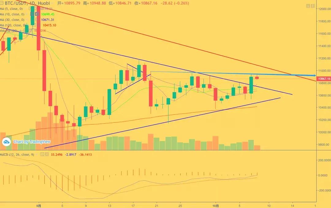 大盘昨日受到支付巨头Square购买5000万美元的比特币利好消息刺激,出现了较强的极速拉升,这波力度这么大风暴也没有预料到,从三角形态来看目前已经选择了向上突破,当前价格在之前的重抛压10900-11000区间受阻,目前三角选择向上突围是真突破还是假突破还不好说,因为拉升的量能并没有产生持续性,不排除大盘走出类似eos那种消息刺激后的萎靡行情。短期研判真突破还是假突破的研判依据是能否突破11000并站稳,短期继续维持10900上方规避风险为主,仓位重的可以考虑减仓留个底仓观望。后续如果站稳11000,那才是真金白银的真突破,届时风暴社群和文章都会提示操作,短期主流币除了bch和eos可以先持有,其他主流建议规避风险为主。压力位:11050,支撑位:10700。