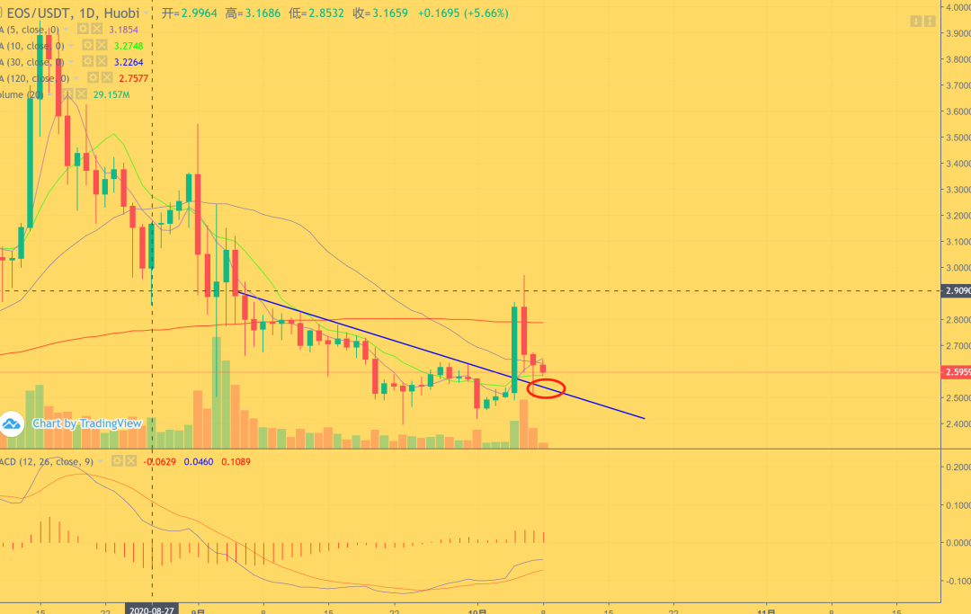 eos之前画的日线级别下跌趋势线突破后阻力转化为支撑,这个支撑这两天被回踩插针认证,短期算是守住了。消息面谷歌云加入eos主网节点并没有带给一波主升行情,属于消息面刺激的局部拉升,这个利好过去就被打回原形,说明整体盘面依旧偏弱,考虑到短期支撑线守住,有仓位可以再拿一拿,止损放在2.5,想介入的可以小仓进场,防守点放在支撑线上2.5左右。压力位:2.7,支撑位:2.5。