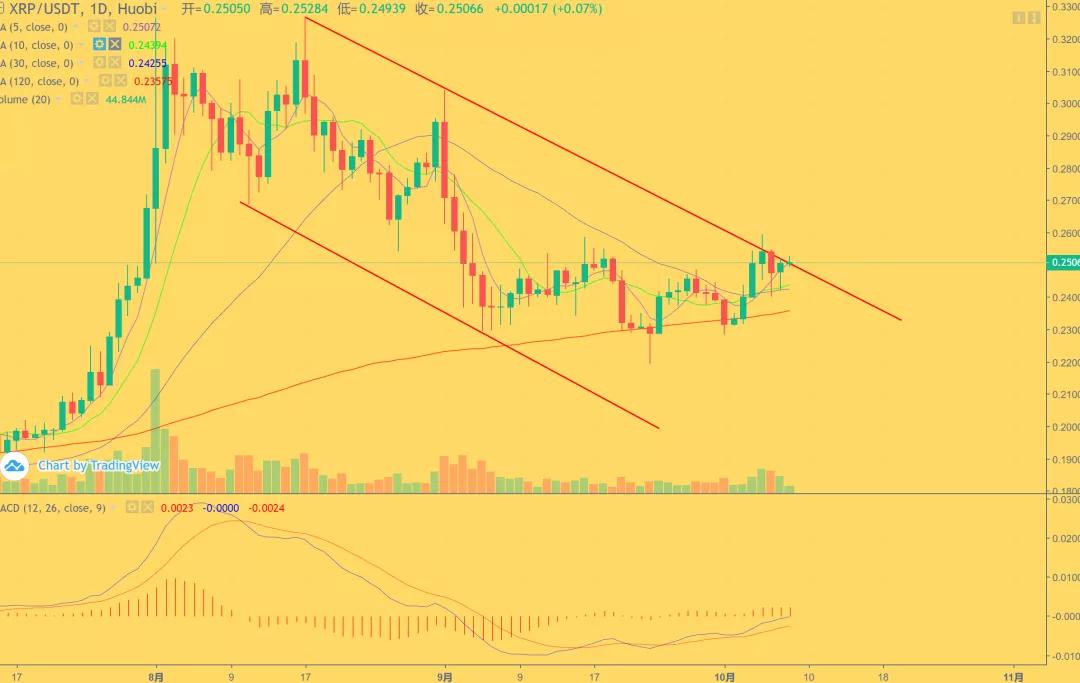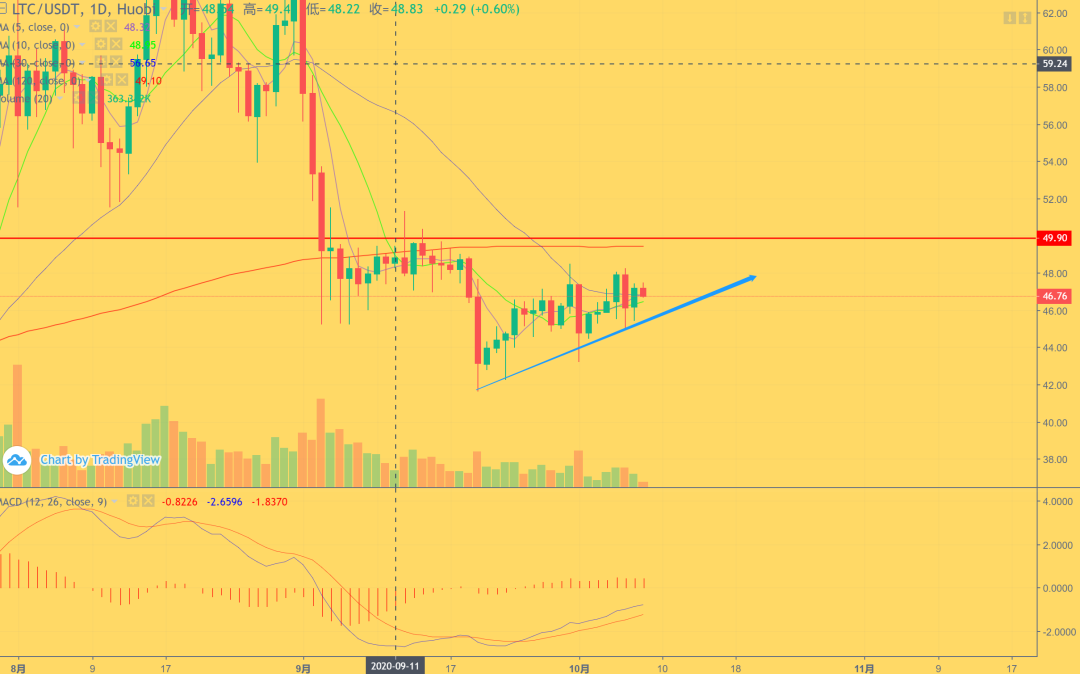ltc日线来看目前还是维持震荡上行走势,macd持续偏移向上,联动大盘行情为主。昨天画的上升趋势线今天依然适用,上升趋势线不跌破前暂时持币为主。下方支撑放在上升趋势线支撑点45,上方压力看到boll上轨压制49附近。操作上可以在上轨压制48上方高抛,上升趋势线45附近低吸。