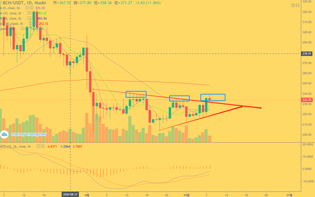bch昨天爆发了一波小惊喜,风暴这两天也及时提示了大家介入,目前日线三角整理形态选择了向上突破,既然已经突破那就继续持币为主,考虑到11月中旬分叉糖果利好,后续有机会走波行情,今天价格抵达我们之前说的235-240阻力区间,这个位置也是之前的强抛压区间,预计这个位置会有小回落,回落不跌回三角上轨耐心持币即可。压力位:240,支撑位:220。