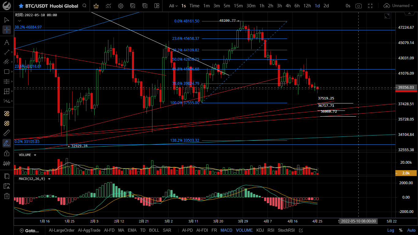 大饼昨日再次试探40000关口承压回落上下插针,早间空头发力低位跌至38670附近,目前币价在39200一线震荡,整体走势和昨日思路一致,恭喜跟上的朋友,四小时级别布林带缩口,MACD空头排列双线粘合有死叉迹象,KDJ三线死叉向下,今天整个外围因素资本市场都在跌,所以不排除继续下跌的可能,目前行情有所反弹,整体较为弱势,k线也是小阳大阴很明显趋势由空头主导,日内操作建议反弹高空为主,关注上方压力39500-40000,下方支撑38500-37500