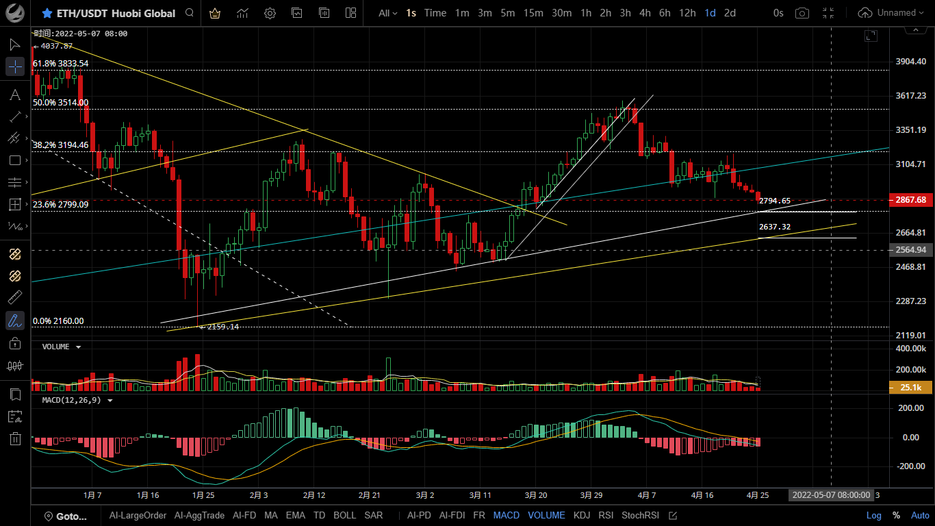 以太坊走势也在意料之内,完美验证文中思路,高位触及2970附近后承压回落,低位跌至2840附近支撑反弹,目前币价在2870一线震荡,四小时级别MACD空头放量双线死叉运行,KDJ三线死叉向下延伸,趋势还是偏向空头,行情仍有下探的空间,大跌之后必有反弹,短期先看一波上行,日内操作反弹高空为主,关注上方压力2920-2970,下方支撑2840-2800