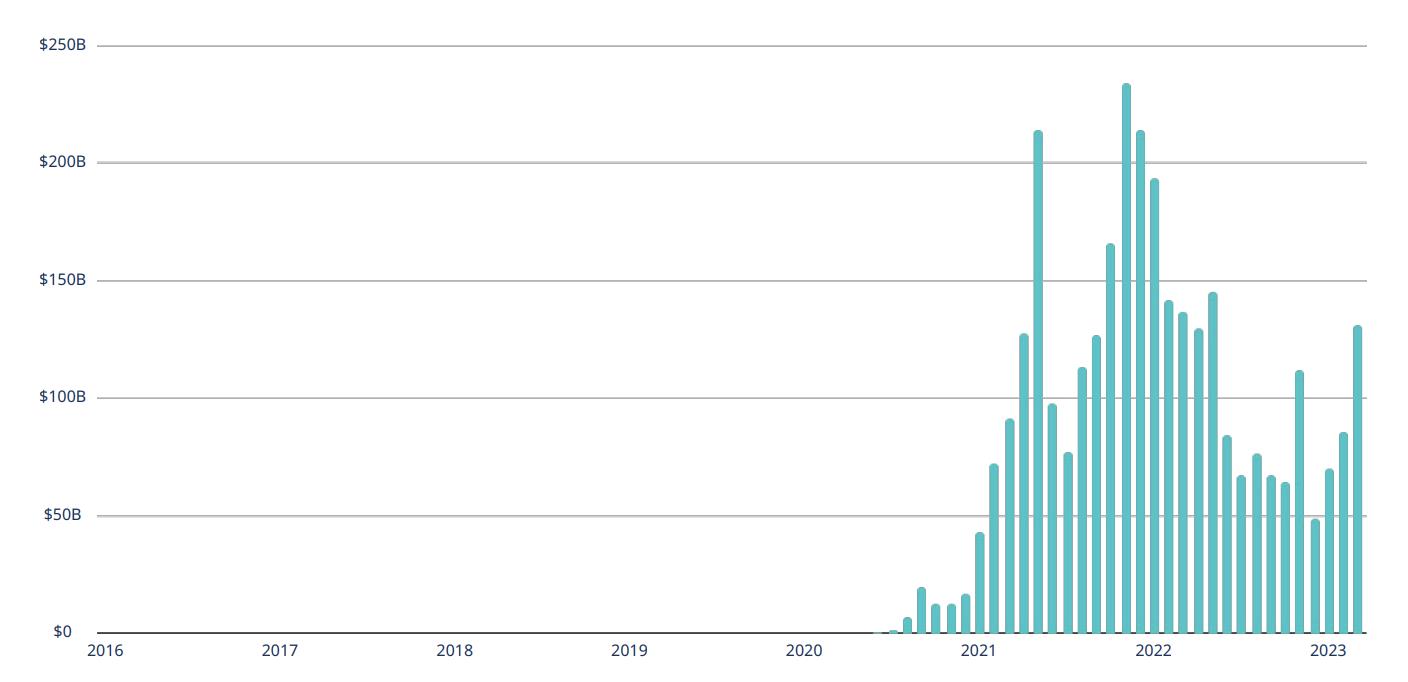 基于以上原因,我们认为DeFi的发展并不是短期的,而将是呈现长期向好的发展趋势。事实上,截止2023年10月24日,DEX的24H交易额为50亿美元,虽然仅占总交易额的1.7%,但是相比2022年日均35亿美元的交易额增长了42%。同时,DEX的月均交易额也突破了100亿美元。
