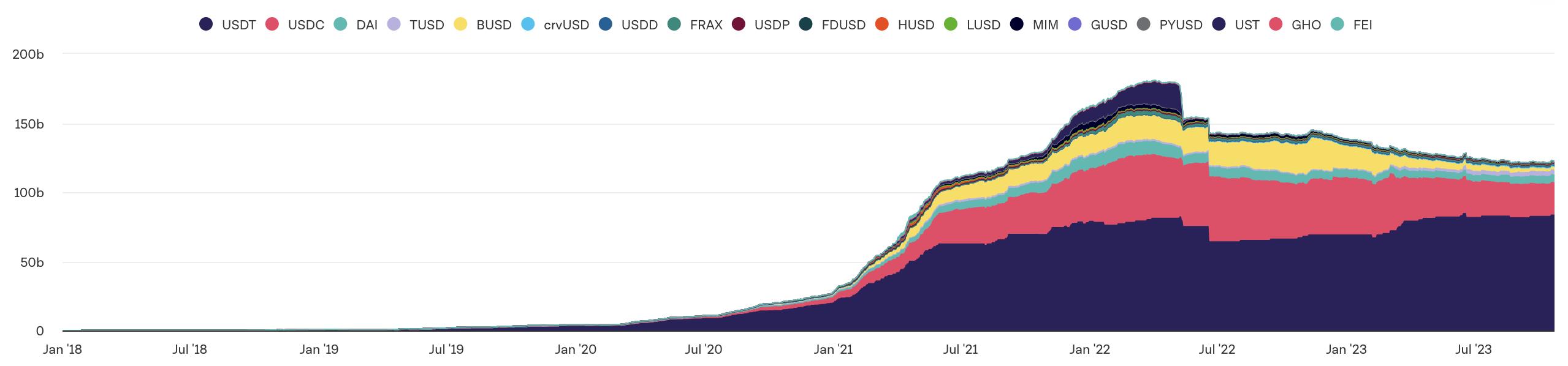 链上稳定币发行规模 来源:The Block、Coin Metrics、DeFillama