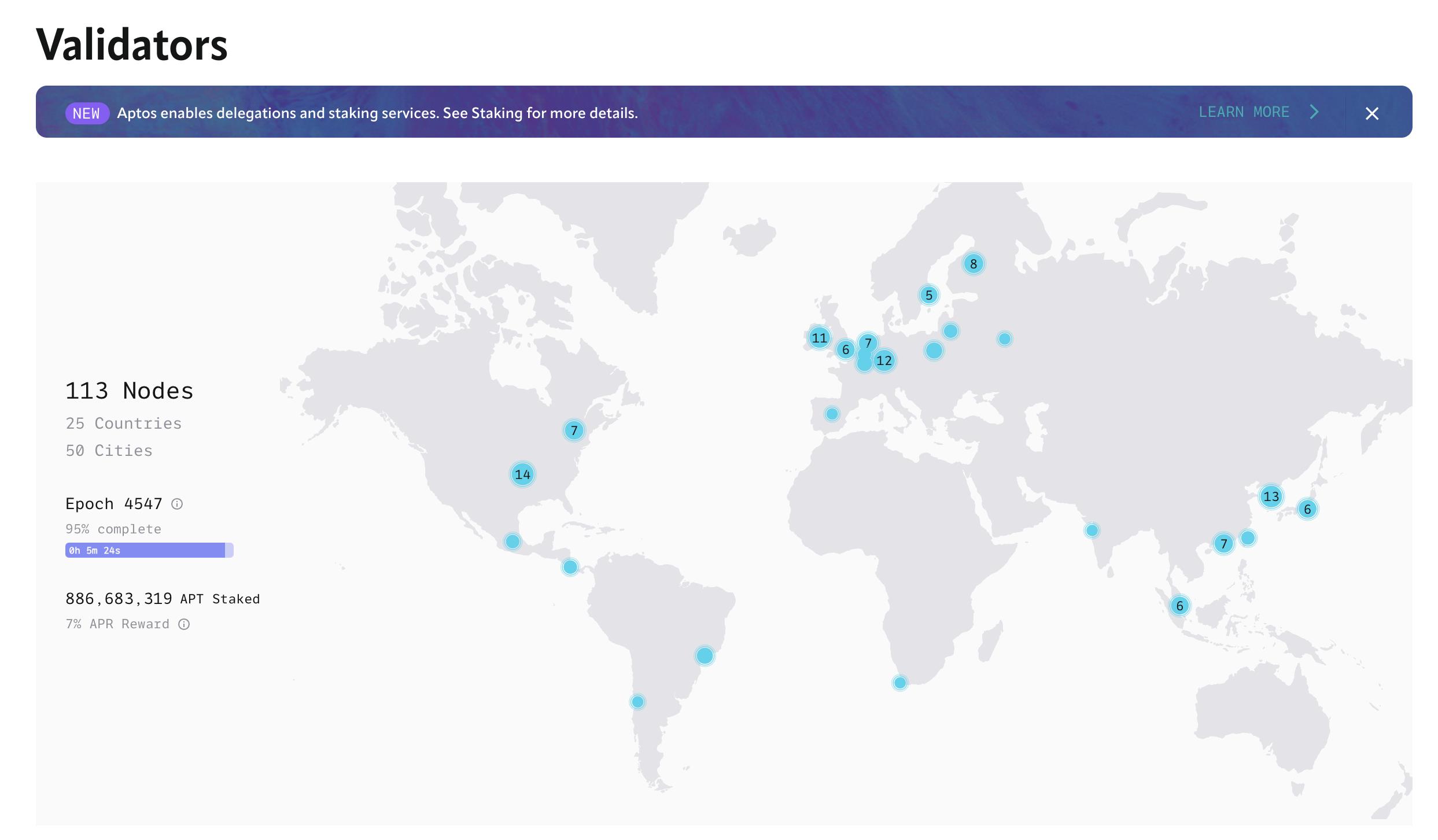 Web3的核心叙事之一就是去中心化,Aptos在这方面也做了大量的工作来吸引更多的验证节点加入到Aptos生态之中。可喜的是,截止2023年10月25日,Aptos已经实现了113个验证节点,遍布全球25个国家的50个城市,共有价值超过50亿美元,合计886683319枚APT质押在网络之中,验证者节点在数量和地理分布上都确保了网络的去中心化和安全性。