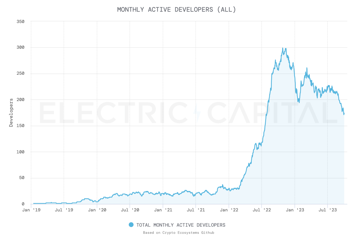 虽然今年年初至今因悲观情绪,月度活跃开发者有所下降,但是相比2022年年初已经有了大幅的增长。而且我们相信,随着Aptos持续的按月进行升级优化公链,会有越来越多的开发者加入。