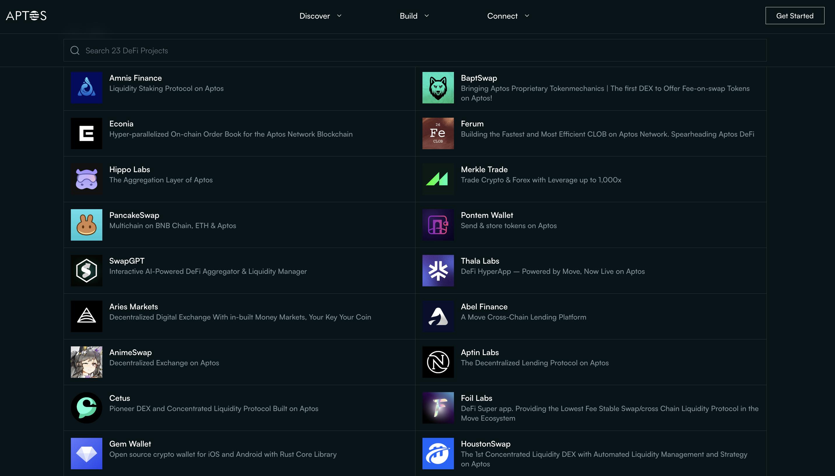 目前,在Aptos官网上展示了23个Defi应用,包括 Pancake、Thala、Merkle Trade、Amnis Finance、Sushi、Econia 等。下面是一些附加的项目。
