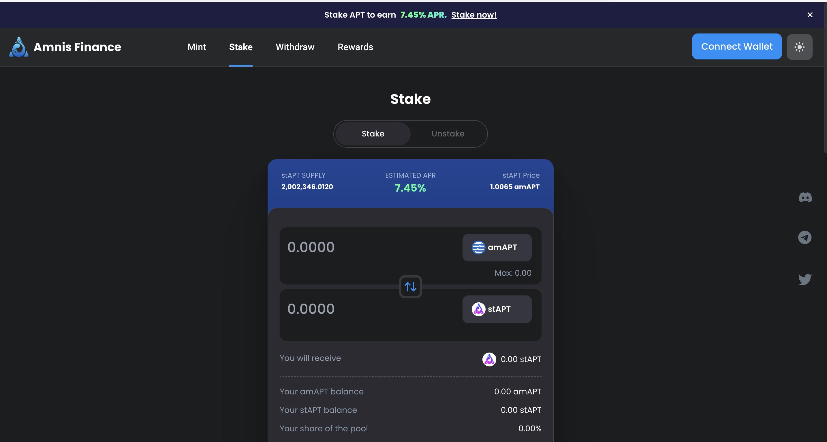 Amnis Finance质押页面 来源:Amnis Finance官网