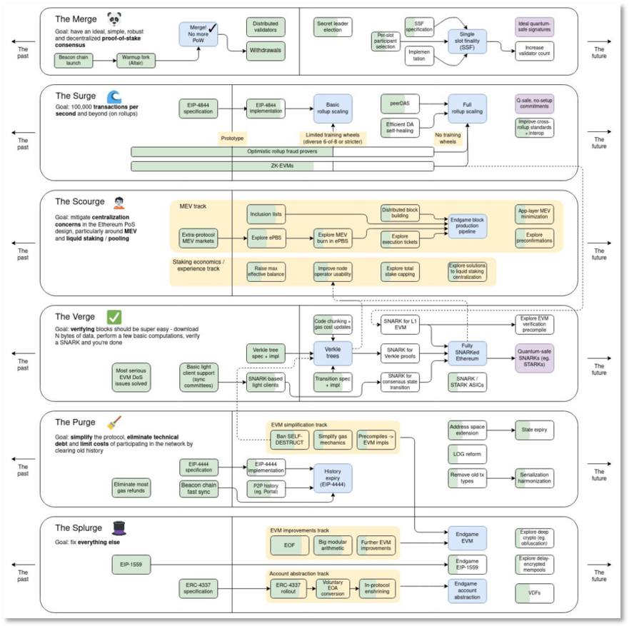 Buterin的路线图还通过 Scourge 等举措解决了 PoS 中经济中心化的挑战。此次重新设计的重点是解决最大可提取价值(MEV)和一般权益池问题,这对于维护网络的完整性和去中心化至关重要。