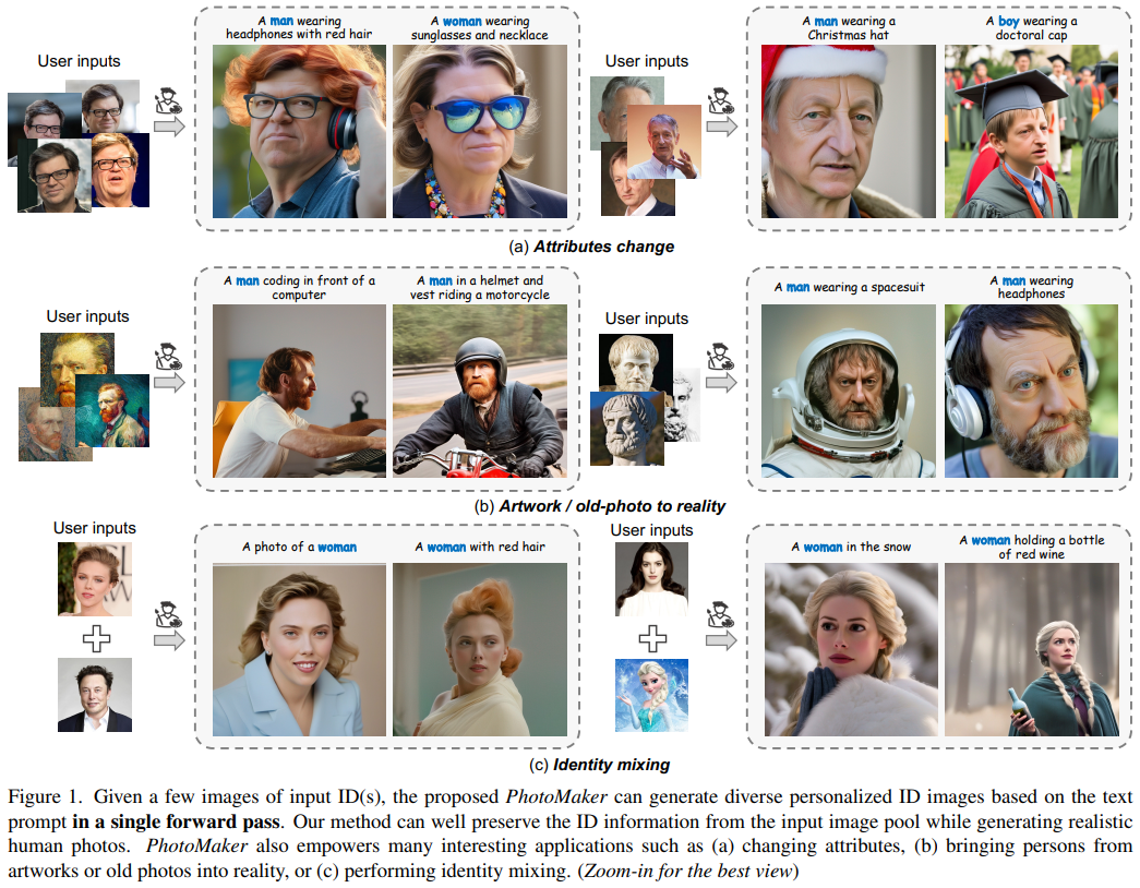 如图 1 所示,PhotoMaker 不仅能进行常见的重新构建,还能改变输入人像的属性(例如,配饰和表情),从输入 ID 生成完全不同视角的人类照片,甚至修改输入 ID 的性别和年龄(见图 1)。
