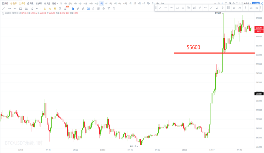 总结:价格短期上破55600一线位置后维持在其上方震荡,后期回调不破此支撑仍有继续上涨的走势,上方阻力关注57900,59300一线;