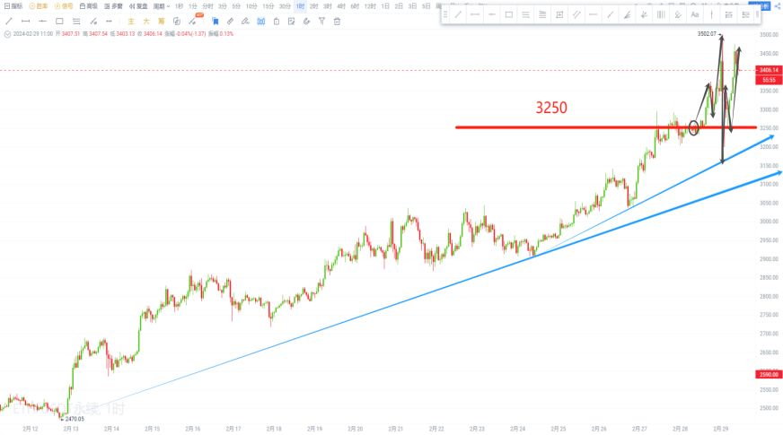 后期走势小幅回调未破3200一线位置后大幅上涨,并成功抵达第二目标34500位置,最高抵达3502位置。