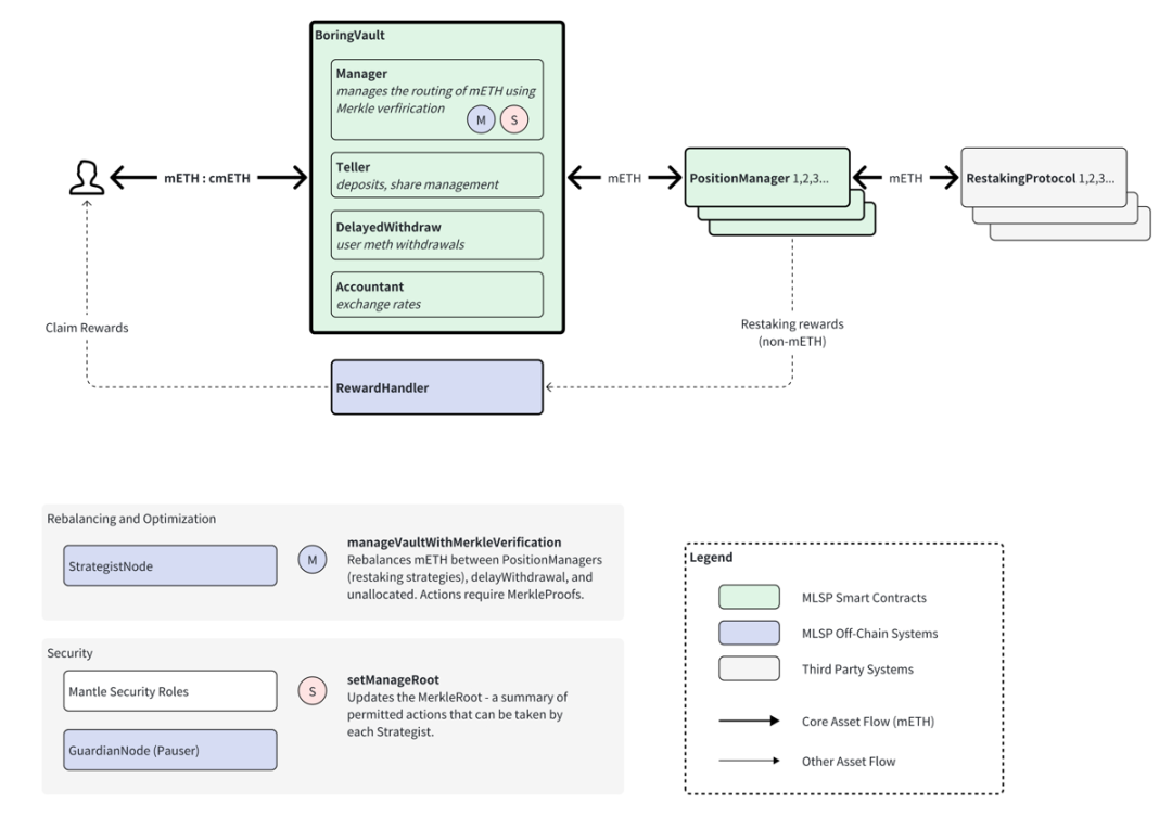 用户的 LST 存入再质押协议中,安全保障由预言机、跨链桥以及 DA 层来负责。部分质押奖励和收入也将会回流至 cmETH 中。
