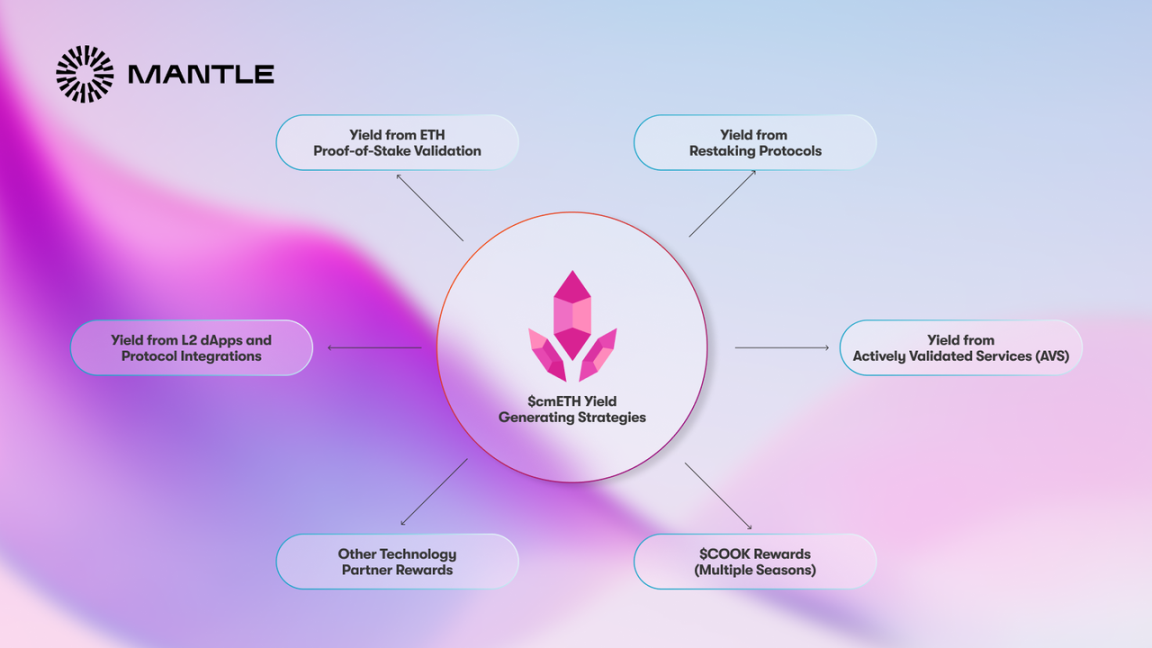 cmETH 在 Mantle 生态中实现了不错的可组合性。其持有者还可享受 ETH 权益证明验证的收益(由底层 mETH 提供),AVS 主动验证服务收益、代币 COOK 奖励、与其他 L2DApp 等集成的收益。链上优势较为明显。