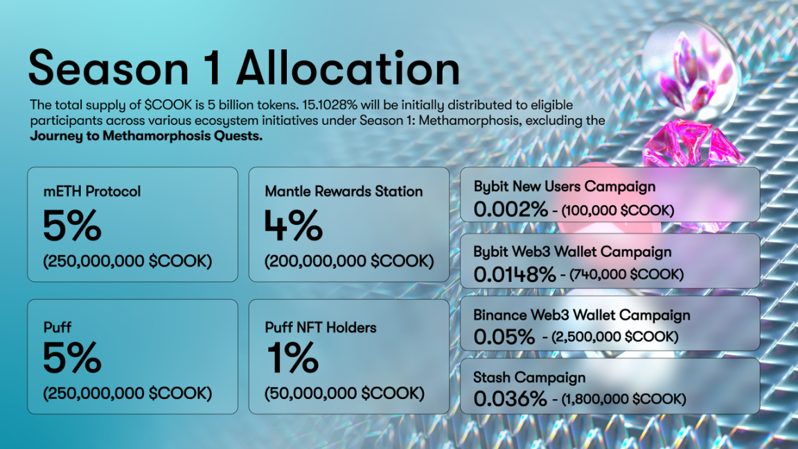 COOK 是 mETH 的新治理代币。目前主要用于对生态系统的方向和其他战略事项进行投票。总量为 50 亿枚,且其中 15.1028% 将分配给第 1 季生态系统活动的合格用户。