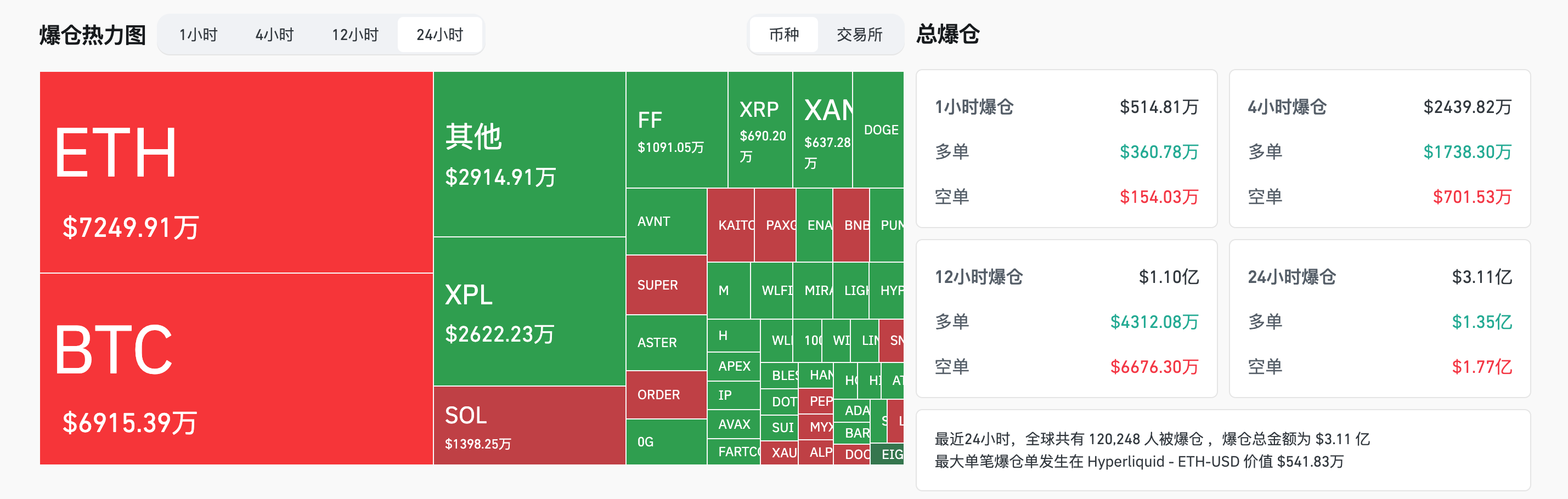衍生品市场方面,据 Coinglass 统计,过去 24 小时共有超过 12 万人遭遇爆仓,全网爆仓金额达 3.11 亿美元,其中多单爆仓 1.35 亿美元,空单爆仓 1.77 亿美元。ETH 爆仓金额达 7249 万美元,成为爆仓「重灾区」;BTC 与 XPL 紧随其后,爆仓金额分别为 6915 万美元与 2622 万美元。