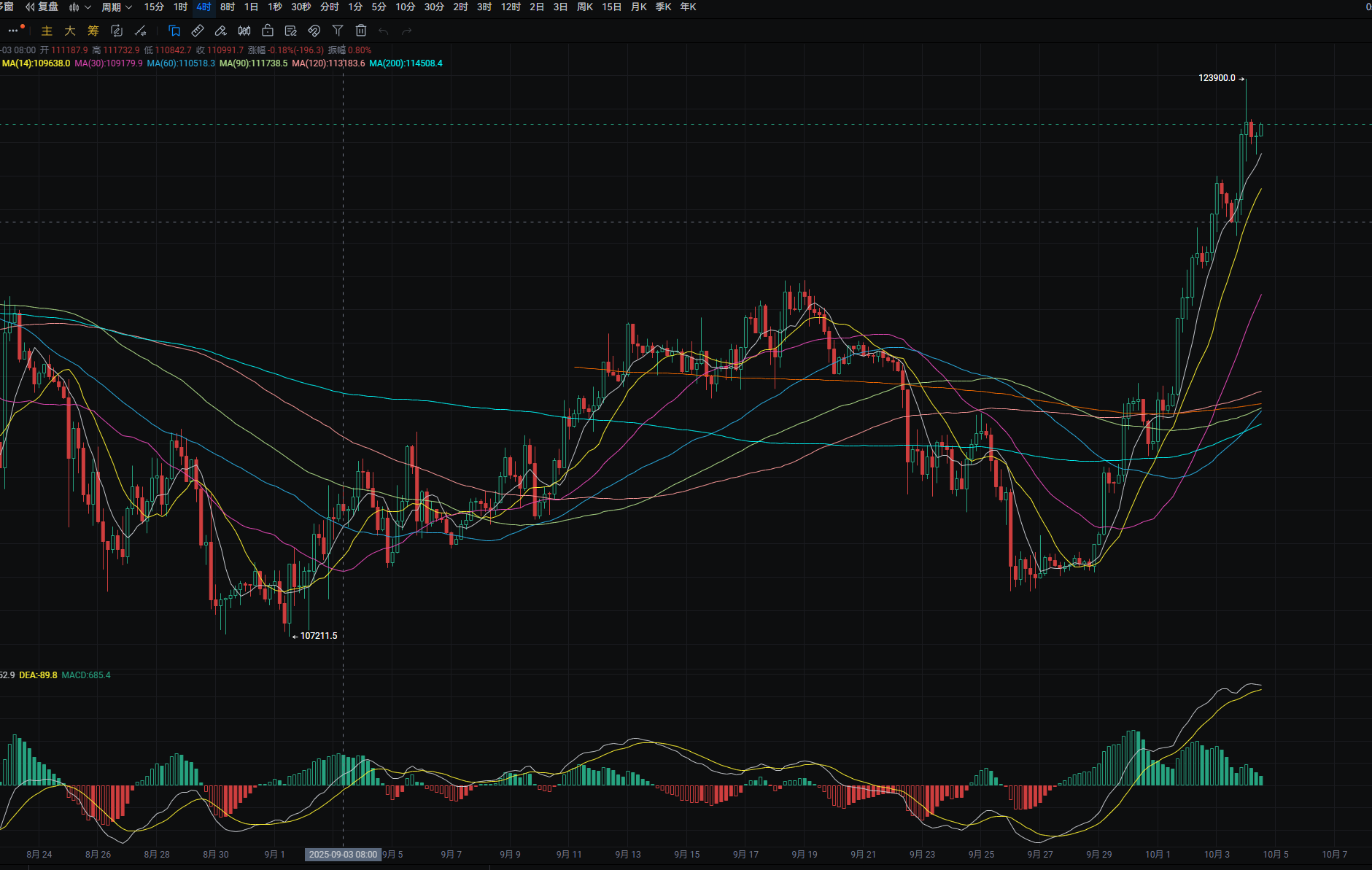 大饼日线昨日从最低119200附近上涨至最高123900附近 收线在122200附近 下方支撑位于120500附近 跌破则可看至MA7均线附近 回踩可在附近进行接多 上方压力位于123300附近 突破则可看至新高 MACD多头增量 四小时下方支撑位于120800附近 跌破则可看至119600附近 回踩可在附近进行接多 MACD多头缩量