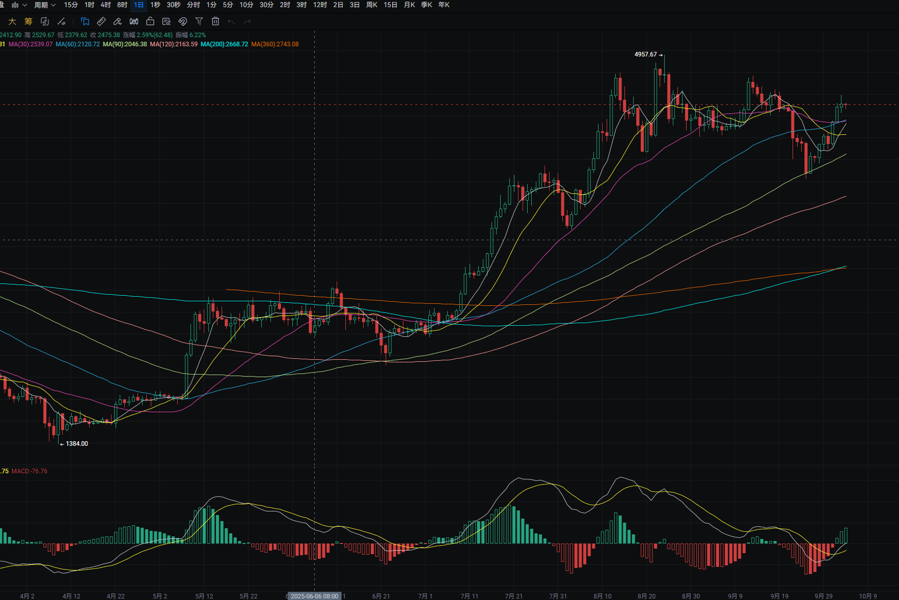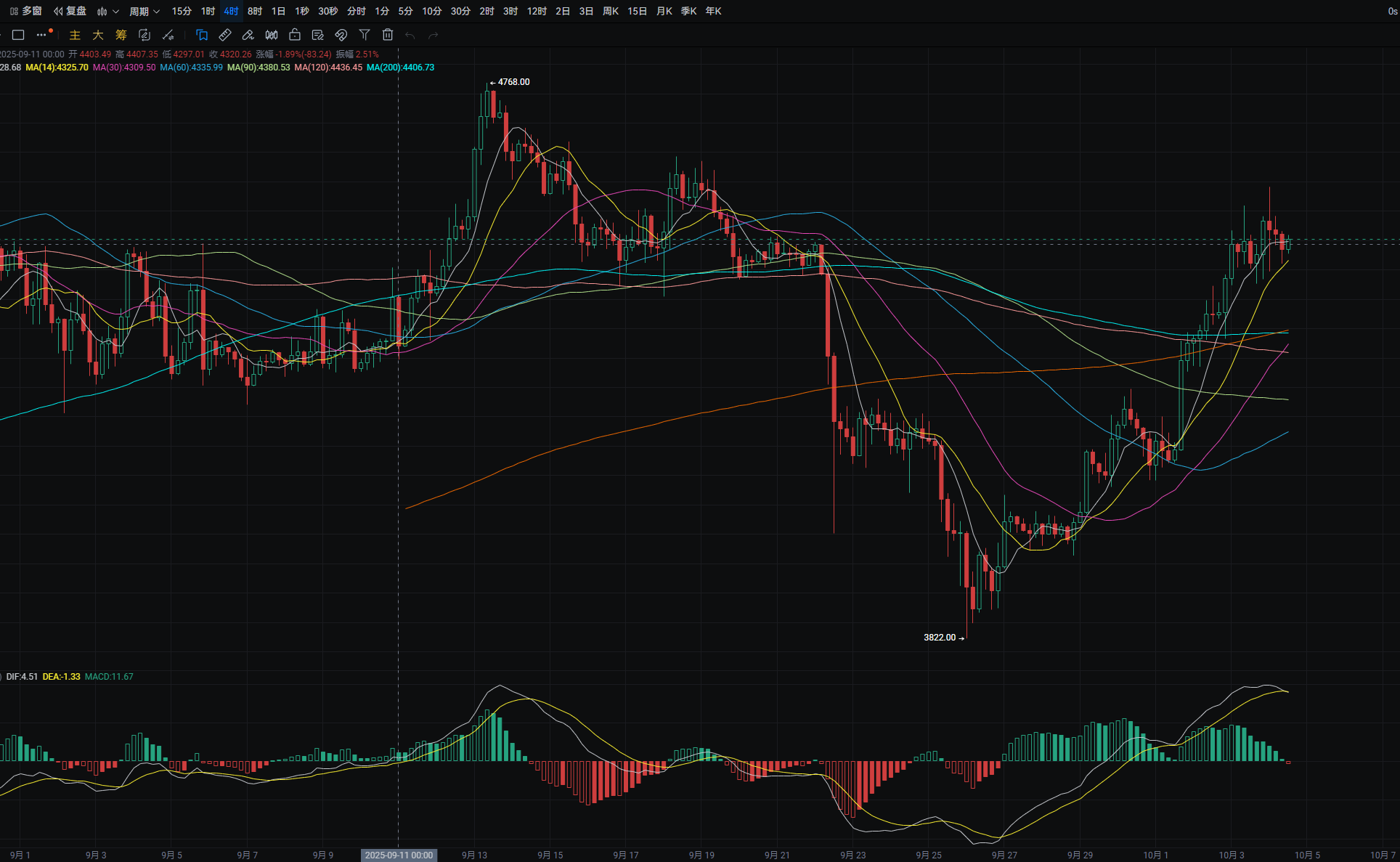 以太日线昨日从最低4425附近上涨至最高4590附近 收线在4510附近 下方支撑位于4390附近 跌破则可看至MA14附近 回踩可在附近进行接多 上方压力位于4590附近 突破则可看至4705附近 反弹至附近可进行接空 MACD多头增量 四小时下方支撑位于4435附近 跌破则可看至4375附近 回踩可在附近进行接多 上方压力位于4550附近 突破则可看至4615附近 反弹至附近可进行接空 MACD多头缩量 有形成死叉的迹象