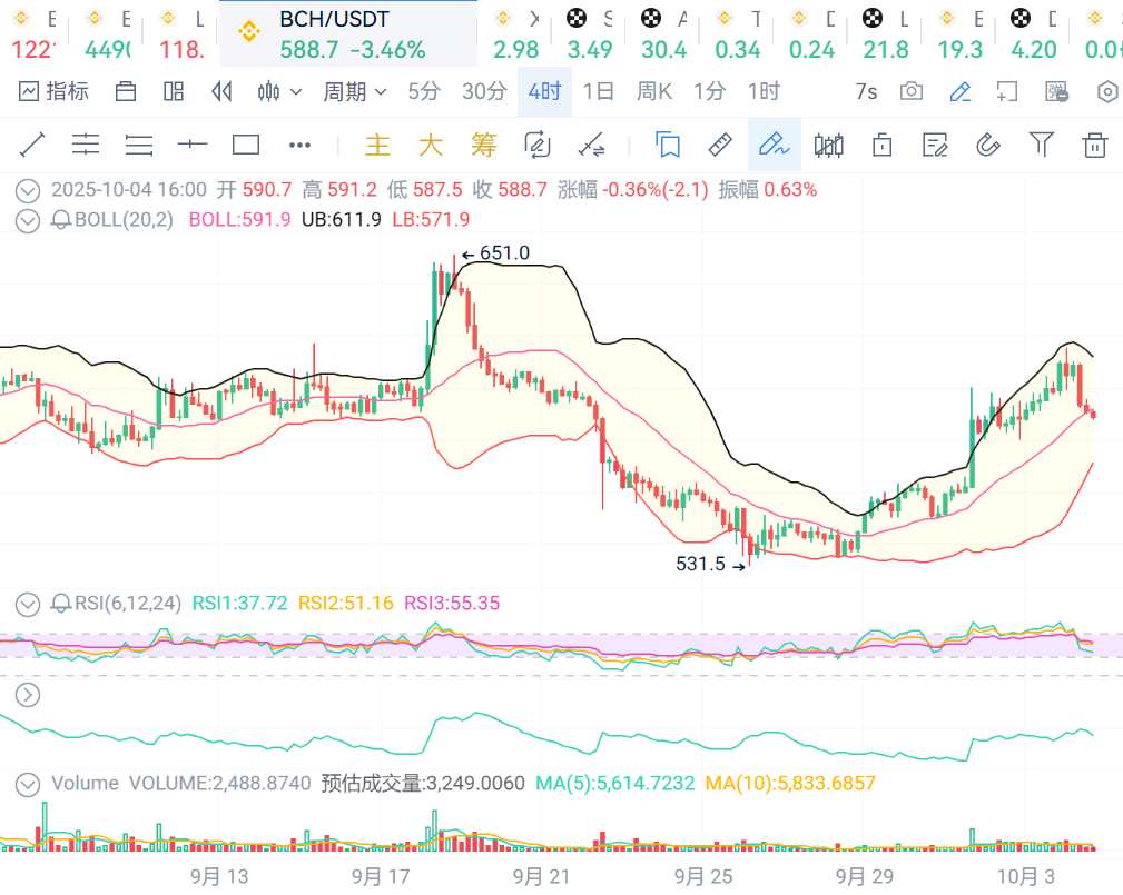 BCH:价格跌破布林线中轨,价格走势弱势,支撑位580,压力位600.