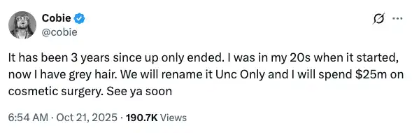 一小时后,Cobie 在 X 上发了一条推文:「UpOnly 结束已经三年了。开始做节目时我才 20 多岁,现在我都有白头发了。我们要把它改名叫『大叔专场』(Unc Only),然后我会花 2500 万美元做整容手术。回头见。」